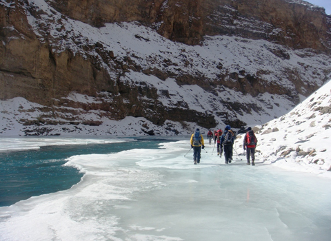 "CHADAR" refers to the blanket or sheet as the Zanskar river transforms itself from a rapid river into a white blanket of ice during winter, a frozen spectacle awaits the trekker to be experienced of glass ice ranging from a bluish tinge to golden yellow that is seen during the few hours that sunlight reaches directly into the gorge to the milky whitish on a moonlit night - as said a trek journey like no other!