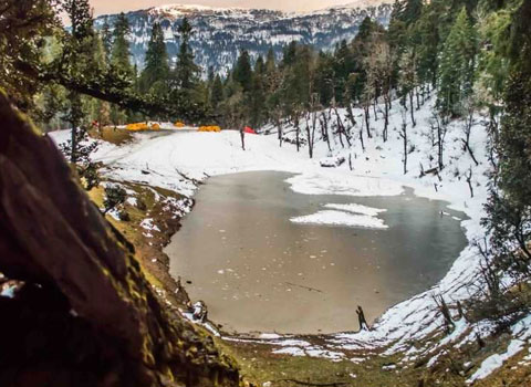 It takes about 4-5 hours to reach Juda Ka Talab, covering 5 km, with an Altitude gain of 2700 feet. Start your trek out of the village Saur, into a pine forest and climb to the top of a ridge. Look out for langoors, wild boars, and hares on your way up. The trail passes through dense pine forests, maple trees, a few streams and finally opens out to a beautiful clearing – Juda lake . Juda-Lake is almost too perfect in its setting as a campsite, with a large lake to your left and a dense oak and pine forest to your right. Dinner at campsite. Spend the night in tents.